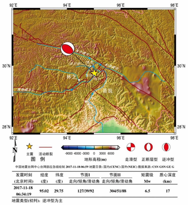 图1 米林Mw6.5级地震发震位置及震源机制解(修改自中国地震台网中心)